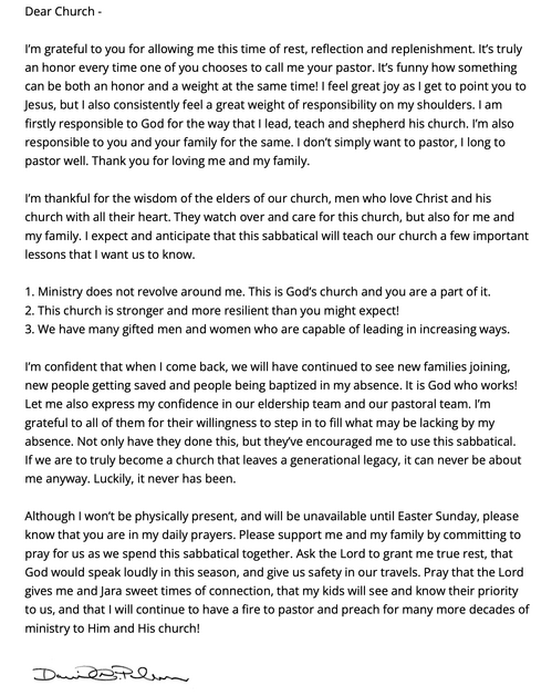 Pastor David Palmer will be on Pastoral Sabbatical Leave from January 5th - March 30th. We ask you to be praying for deep rest and replenishment, for safety as they travel, and for this to be a season where they grow closer to God.